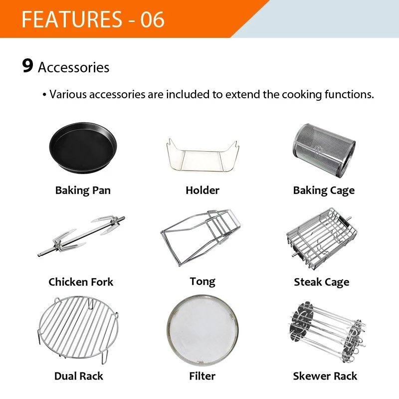 – 9 Accessories: Various accessories are included to extend the cooking functions
