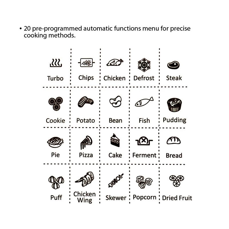 – Digital Control Panel: Manual programs – Timer up to 60 min, temperature up to 250 degree celcius, fan speed and rotation / Automatic program – 20 functions menu for precise cooking methods